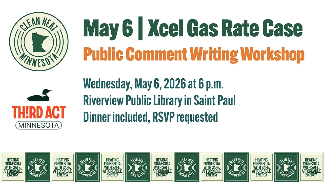 Come join Clean Heat Minnesota and Third Act Minnesota for an in-person public comment workshop about Xcel Energy’s current gas rate case on May 6, 2026, from 5:45-7:30 p.m. at the Riverview Public Library in Saint Paul.